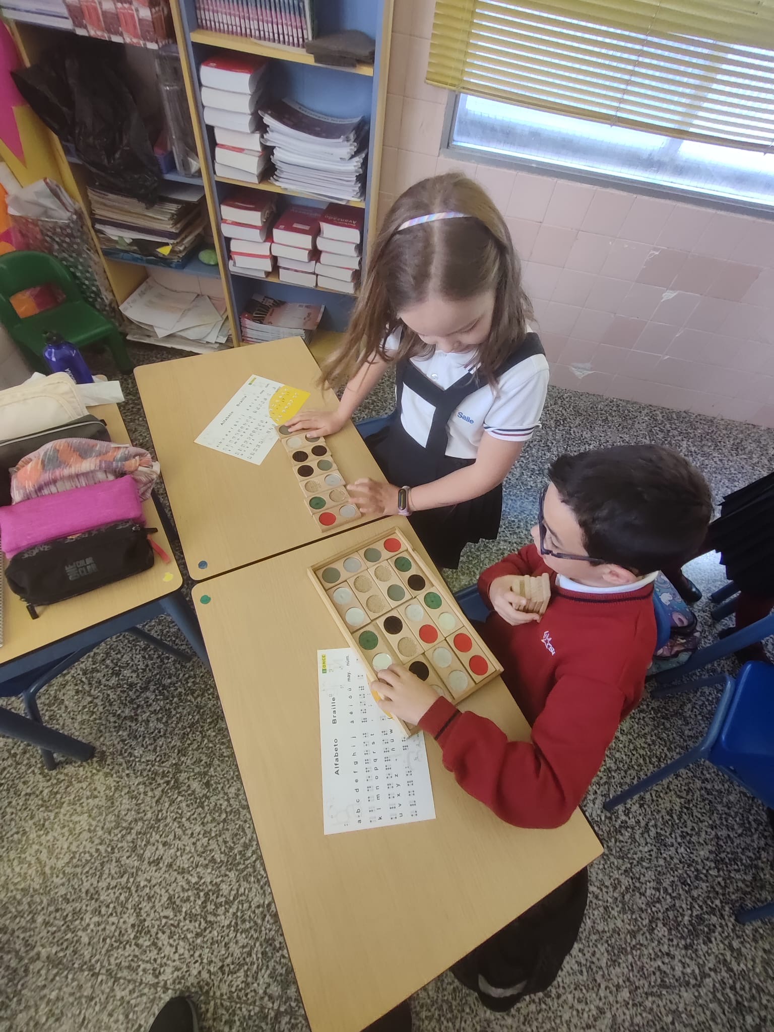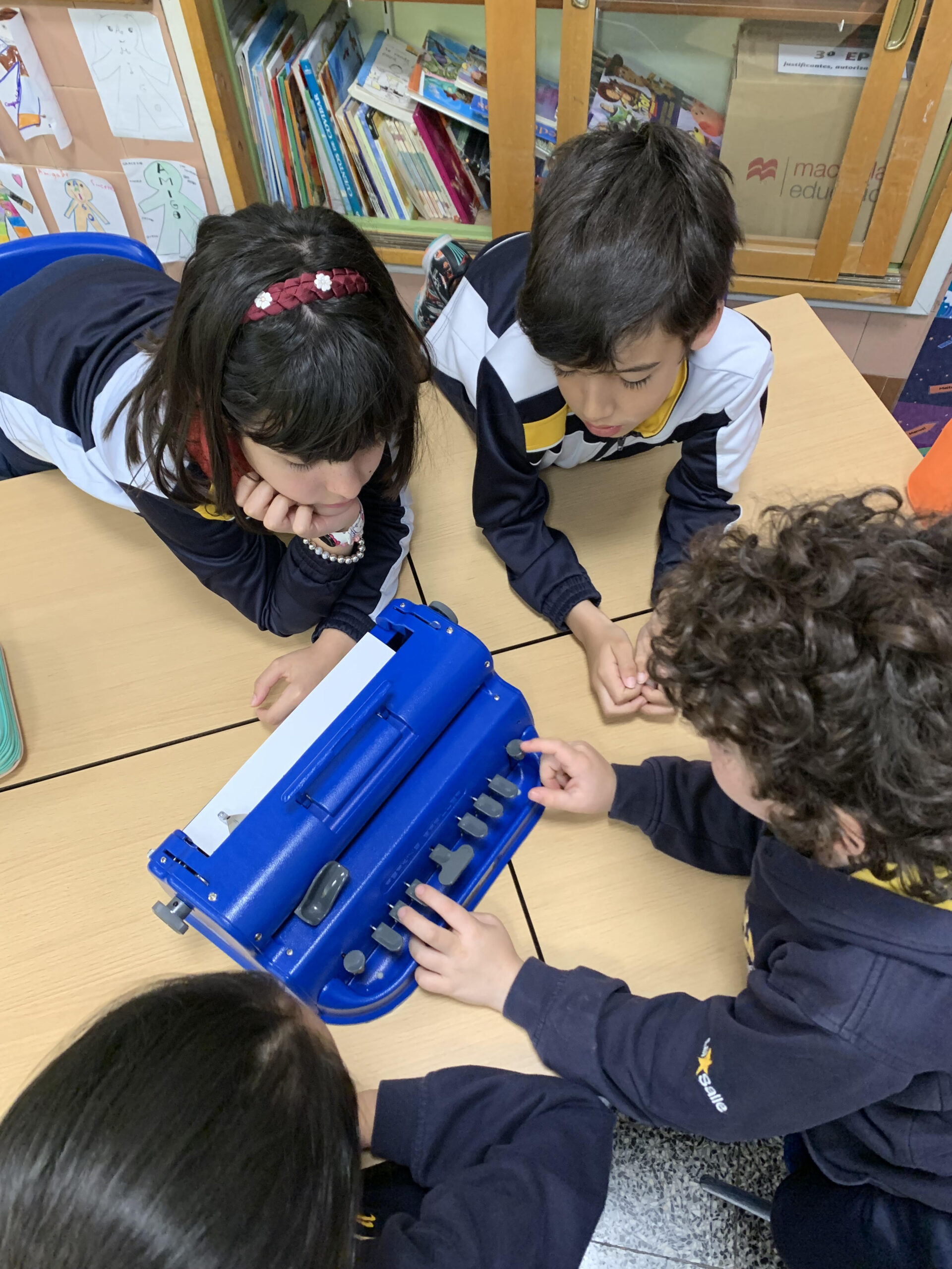 La semana pasada tuvimos la visita de una profe especialista en enseñanza para niños con ceguera. Durante la sesión aprendimos cuáles son los recursos que los niños y niñas invidentes tienen para poder aprender con la misma normalidad con la que nosotros lo hacemos. Leímos libros en braille, vimos y tocamos como son sus mapas y juegos y hasta escribimos con la máquina Perkins, que es la máquina que la gente invidente usa para escribir.